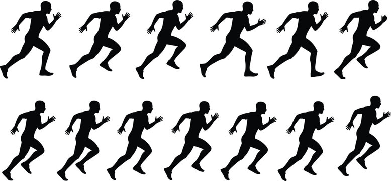 Running motion silhouettes, human stride cycle, athletic biomechanics, sports movement breakdown, black vector sequence set - flat vector illustration