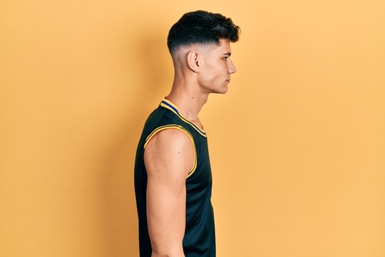 Young hispanic man wearing basketball uniform looking to side, relax profile pose with natural face with confident smile.