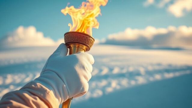 White gloved hand gripping flaming olympic torch against snowy mountain backdrop during Winter Olympics torch relay in Italy