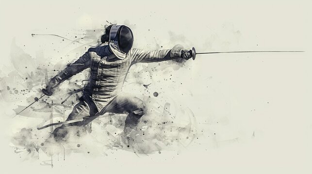Illustration of an athlete in a fencing suit, protective helmet with a foil in his hand in action on a white background with space for text. Sports, competitions, professional skills, achievements.