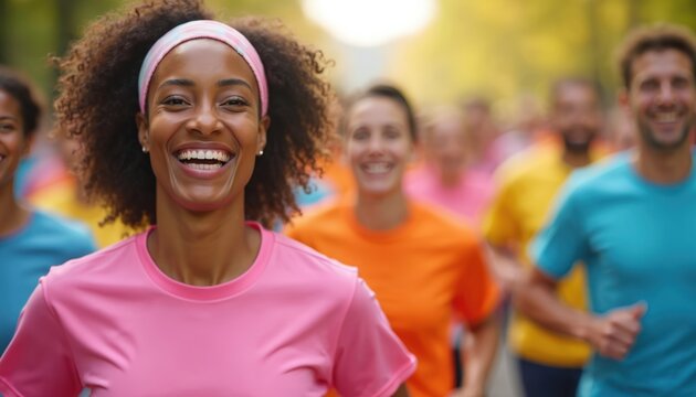Diverse women joyful at charity marathon event