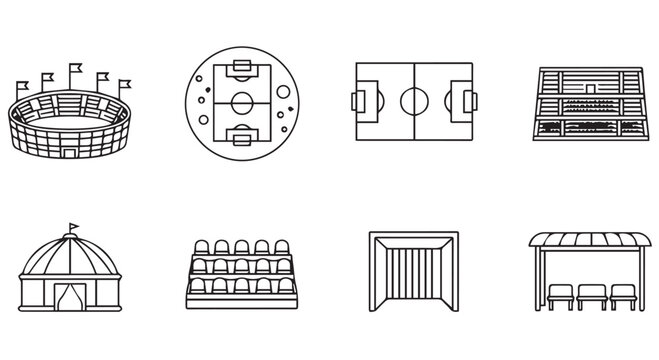 A compilation of black and white line art icons related to sports stadiums and fields, featuring grandstands, playing surfaces, and entryways isolated on transparent background