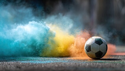 Soccer ball in colorful smoke, outdoor game, asphalt background, celebratory atmosphere, sports imagery