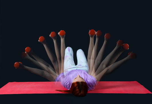 Young fitness trainer with dumbbells in motion on dark background