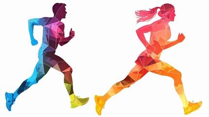 A colorful, geometric illustration of a man and woman running, side by side.  The man is on the left and the woman is on the right. They are both running in a dynamic and athletic posture.