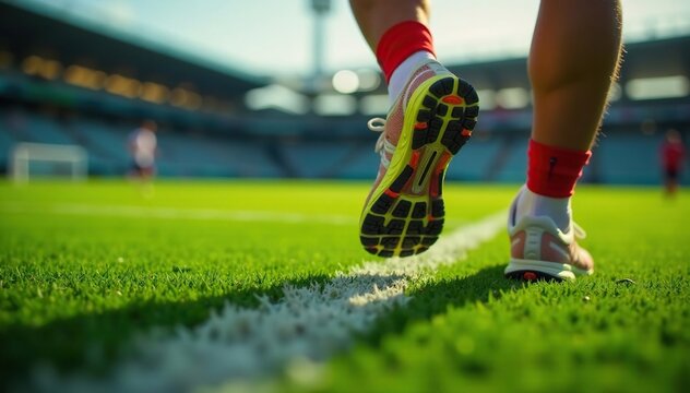 Close-up of running shoes on a football field's turf , achievement, sport