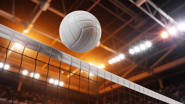 Female volleyball player leaps high, powerfully spiking the ball during an intense match in a vibrant indoor arena
