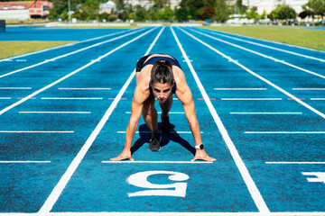 Close up of male athlete getting ready to start running on track . Focus on sneakers