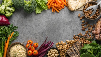 Healthy low carbohydrate meal assortment featuring vegetables, seafood, protein, dairy, and nuts - Atkins eating plan