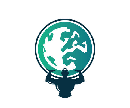 Strong silhouette of a muscular man holding a large sphere above his head against a white background