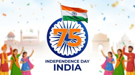 Indias seventy-fifth anniversary logo with the indian flag above it and silhouettes of people raising their arms below it