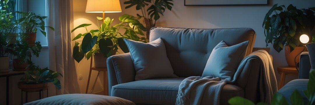 Cozy living room with soft lighting, comfortable armchair, green plants, serene home environment