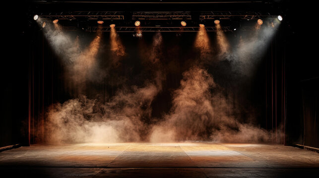 Mysterious and atmospheric scene with dark empty space. Floor is illuminated by spotlight creating dramatic interplay of light and shadows. Presence of smoke or mist element of mystery ambiance