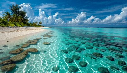 Scenic vista of a tropical atoll with clear waters and sandy shores under a bright sky