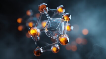 A detailed molecular structure illustration featuring a complex arrangement of glass-like atoms connected by bonds, in a smoky backdrop.?