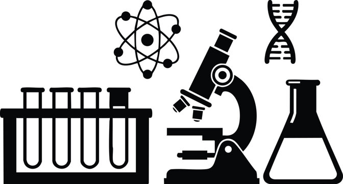 Monochrome science vector art with microscope test tubes atom symbol dna helix and laboratory flask in simple flat silhouette style for research education design