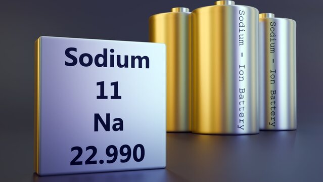 A 3d rendered image displays two cylindrical "Sodium - Ion Battery" cells flanking a silver periodic table tile for Sodium (Na), atomic number 11, and atomic mass 22.990. Next-gen battery technology.