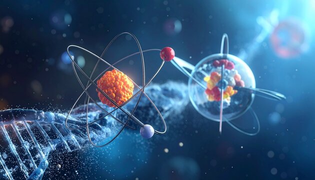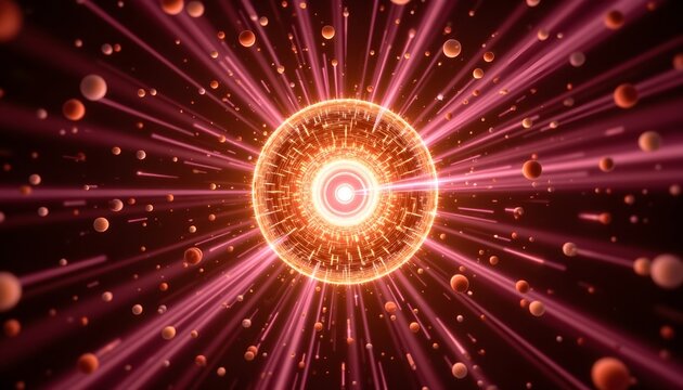 Surrealistic glowing spheres resembling atomic nuclei in a stylized circular structure,