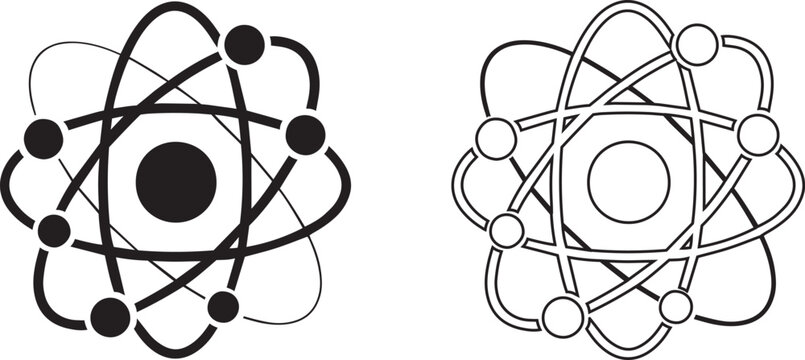 Black and white atom symbol with orbiting electrons and nucleus atomic science