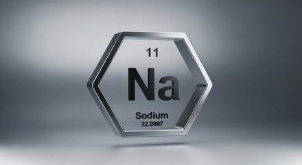 3D metallic rendering of the chemical element Sodium (Na) from the periodic table. The image highlights a futuristic, scientific design with a shiny silver finish and clear typography.