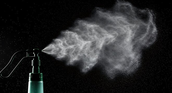 A detailed macro shot of a dispenser nozzle spraying a fine mist, creating a cloud of atomized liquid particles against a solid black background