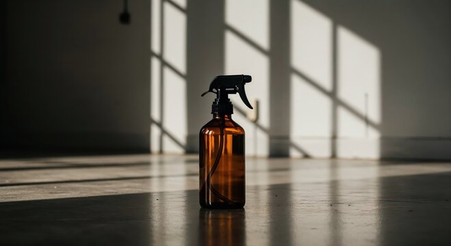 Artisanal Spray Bottle: A meticulously crafted glass spray bottle stands proudly in a minimalist scene, casting intriguing shadows across the floor, highlighting the intersection of form and function.
