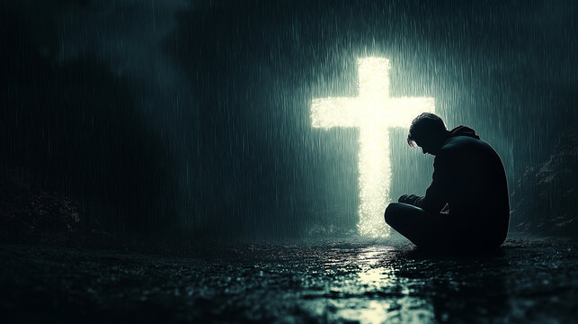 Girl praying isolated on black, light falling on face as sign of forgiveness