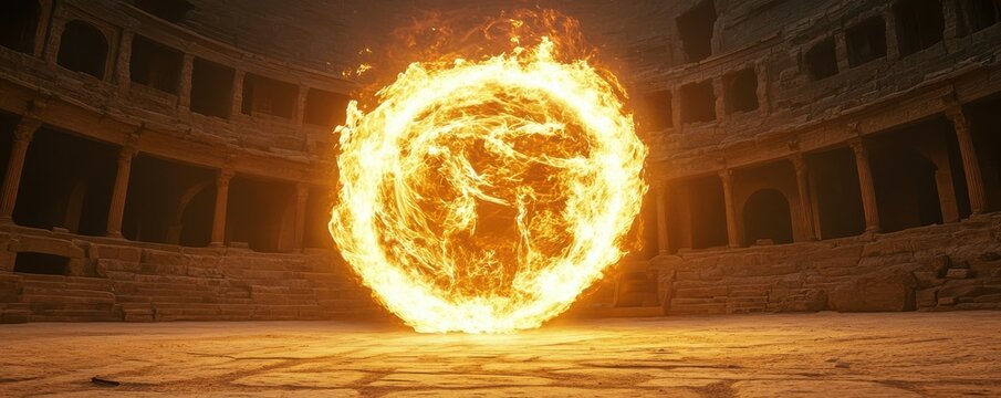 Flaming fireball in ancient stone arena surrounded by empty spectator seats at night