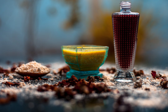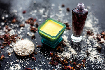 Face mask for skin whitening on wooden surface consisting of besan or gram flour and some rose water. With some dried rose petals and gram flour spread on the surface. Horizontal shot.