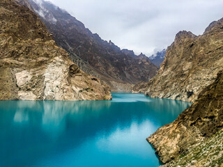 Breathtaking view of the turquoise Attabad lake, with the reflection of the mountains and peaks, aerial view of hills and snow peak in the background, beautiful Gilgit Baltistan area, Pakistan