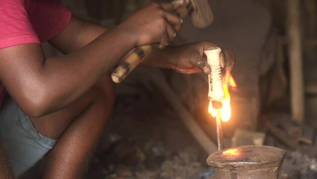 South American man attaching the handle on a newly forged knife in flames. Close up
