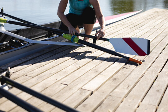 Low section of senior caucasian female rower attaching oars to the boat near the wooden dock