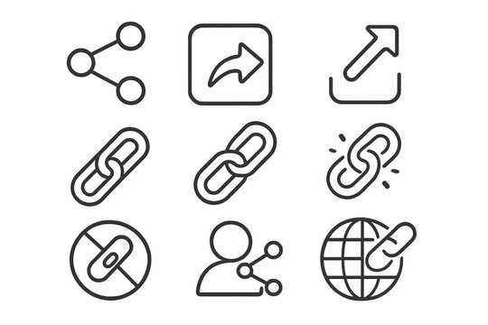 Share and link icon set. Line art connection symbols for web and app UI design. Vector outline pictogram pack for interface. Send, network, hyperlink, connect signs.