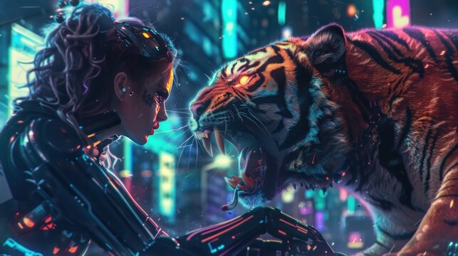 Woman vs robot tiger attacking each other against the backdrop of a modern city AI generated image