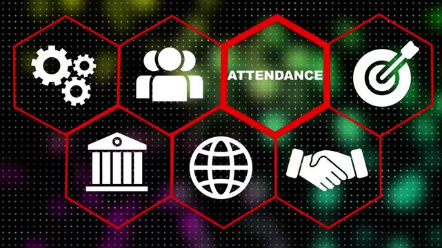 Neon line Attendance business concept display with hexagon shapes and sciencetic symbols on rotating world map icon. technology network background