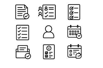 Follow-up Icons Set. Follow-up and Minutes. Line icon set of Follow-up and Minutes: meeting minutes document, attendance list, decisions check, action items