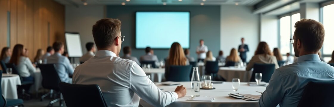 People attending business conference in hall. Man presents report on screen during seminar. Businessmen meeting concept. Education workshop for leadership teamwork collaboration. Corporate team