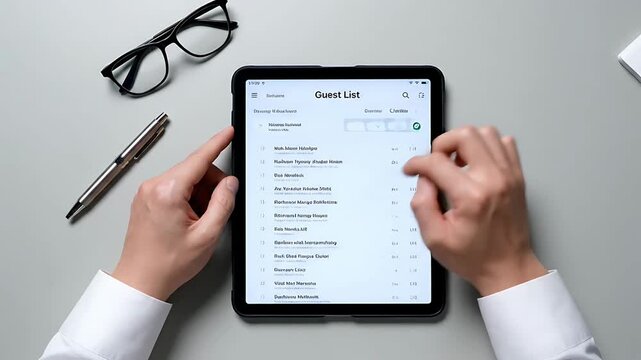 Person Using Tablet to Manage Guest List for Event Planning on a Modern Desk with Eyeglasses and Pen Digital Business Organization
