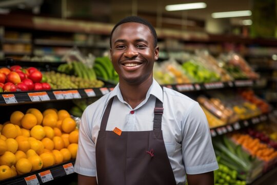 Young happy African sales male supermarket attendant adult list entrepreneur.