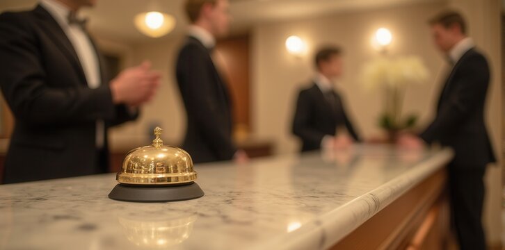 A polished hotel bell gleams on a wooden counter, with staff attending to guests in the background.