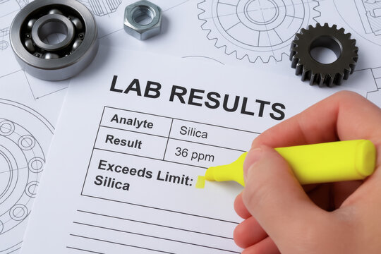 Lab results sheet with analysis of silica and oil contamination in industry report highlighted for urgent attention