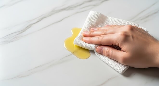 Hand cleaning oil spill with cloth on marble surface in kitchen