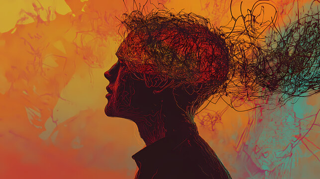 A human head, its surface adorned with a kaleidoscope of puzzle pieces representing the multifaceted nature of attention deficit hyperactivity disorder, the mental health condition that can