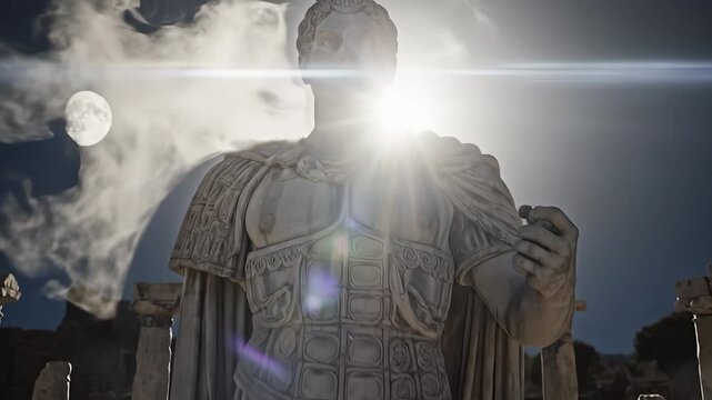 A majestic statue stands amidst ancient stone columns, illuminated by moonlight while clouds drift overhead. The statue's presence commands attention in this historical setting und