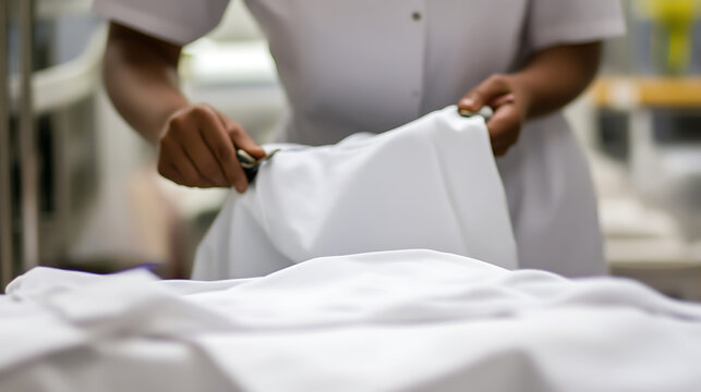 Person wearing a white coat folding a crisp white textile. The act showcases attention to detail and care, highlighting purity and cleanliness. An image of meticulous service.