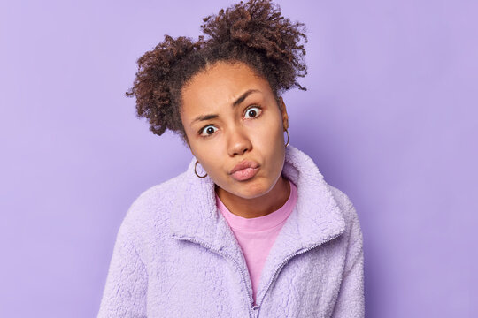 Curly haired beautiful young woman looks with attentive gaze at camera pouts lips focused at something dressed in warm fur jacket listens information attentively isolated over purple background.