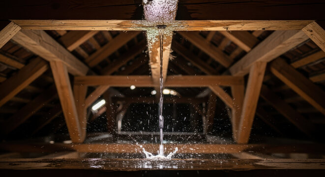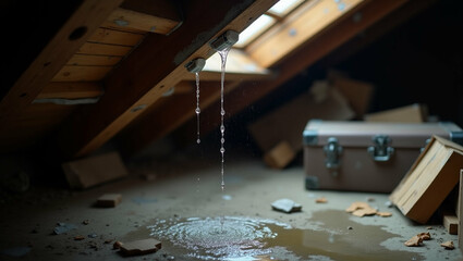 Leak in roof with water dripping from attic beams. Leaky roof causes water damage with pooling water on wooden surfaces. This image illustrates home repair needs for leakage situations.