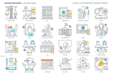 Law dictionary related, color line, vector icon, illustration set