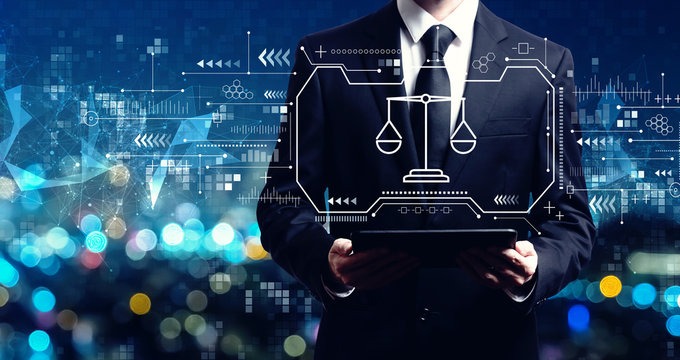 Justice theme with businessman holding a tablet computer
