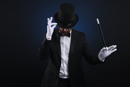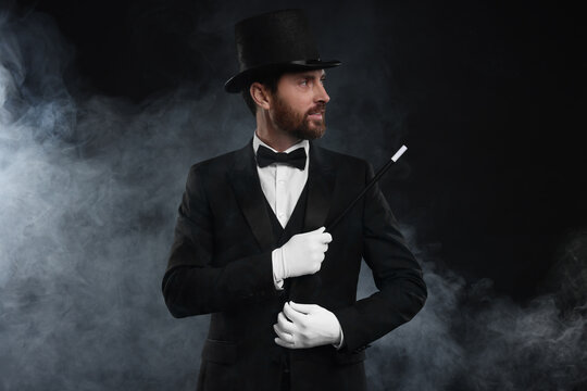Magician holding wand in smoke on dark background, closeup. Space for text